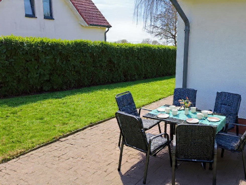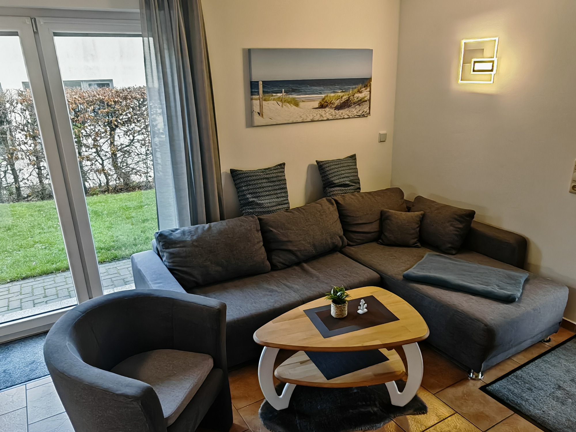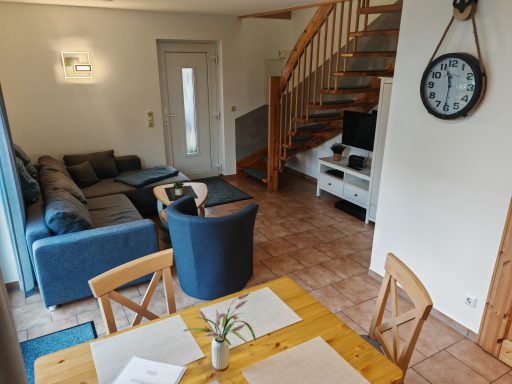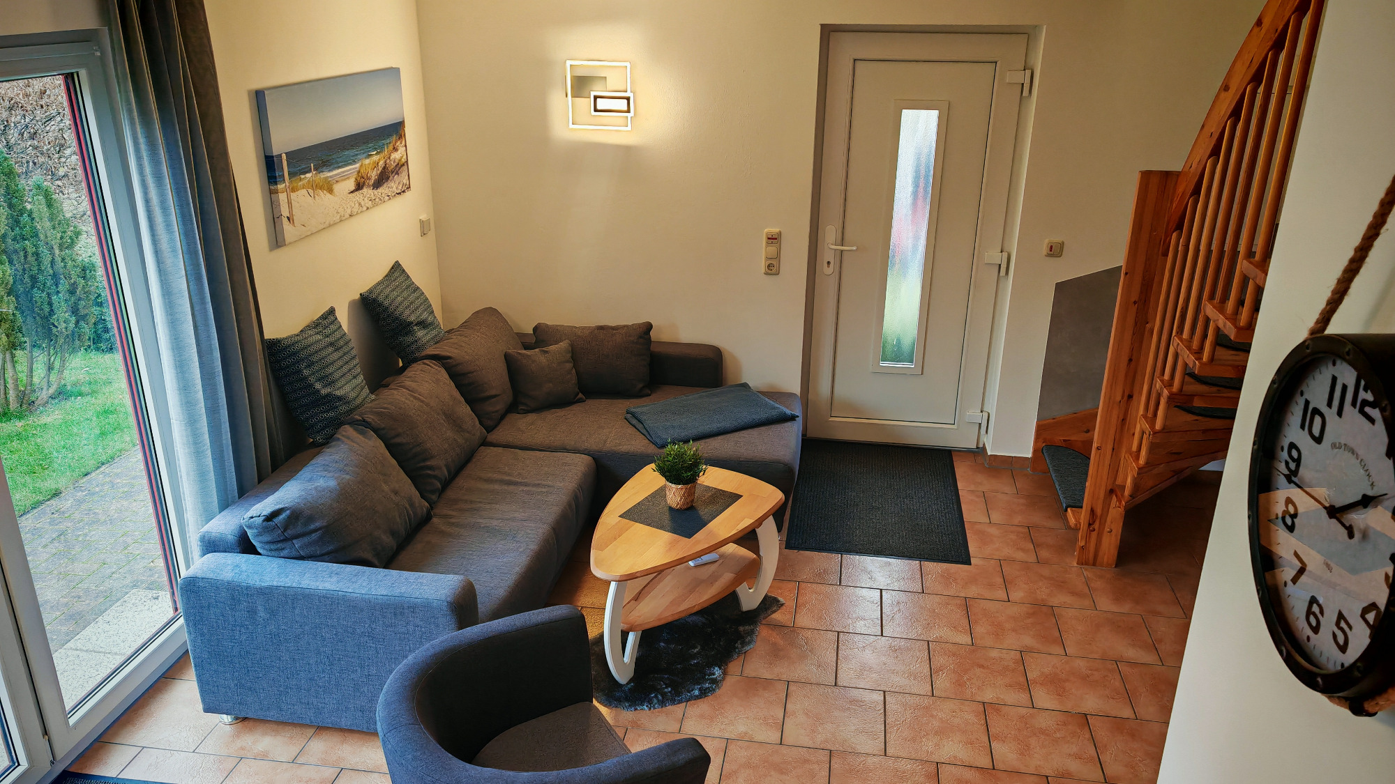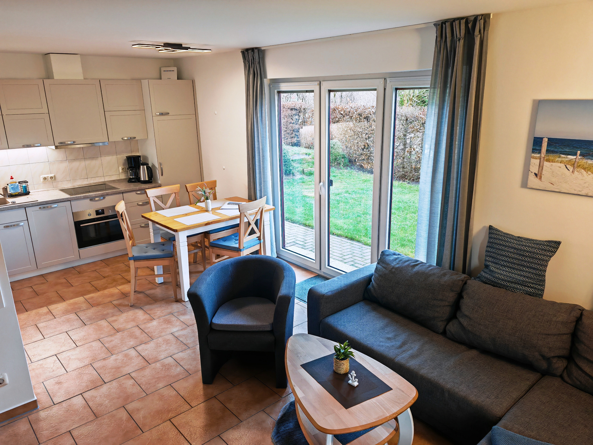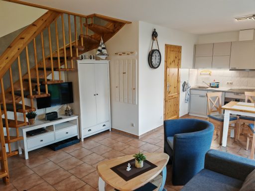 Die Doppelhaushälfte bietet Ihnen bei einer Wohnfläche von ca. 56 m² und einer großen Terrasse ein angenehmes Wohnerlebnis. Das Haus verfügt im Erdgeschoss über einen hellen Wohn-/ Essbereich (ausziehbare Schlafcouch für die 5. und 6. Person) mit einer integrierten Küche. Die Küche ist modern und komplett ausgestattet ( Backofen mit integrierter Mikrowelle, Cerankochfeld, Geschirrspüler, Kühlschrank mit Gefrierfach, Wasserkocher, Toaster und Kaffeemaschine). Im Wohnzimmer ist ein TV Gerät, ein Radio und ein CD-Player vorhanden.
