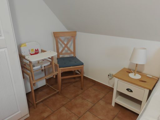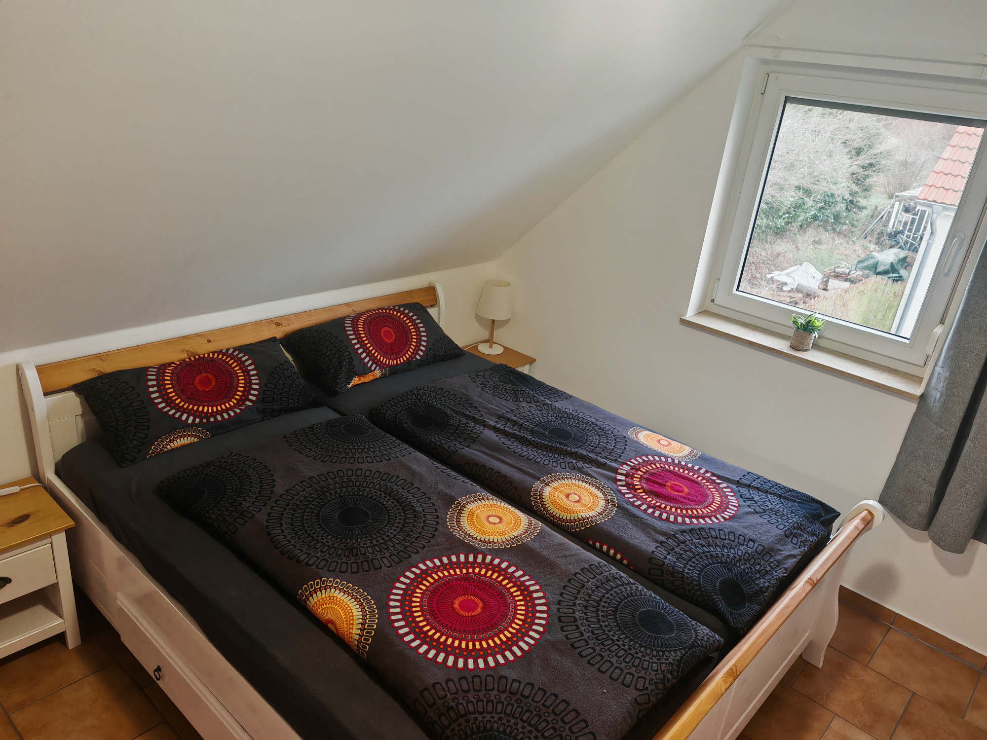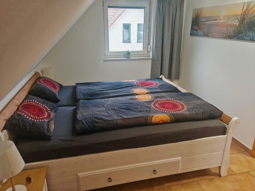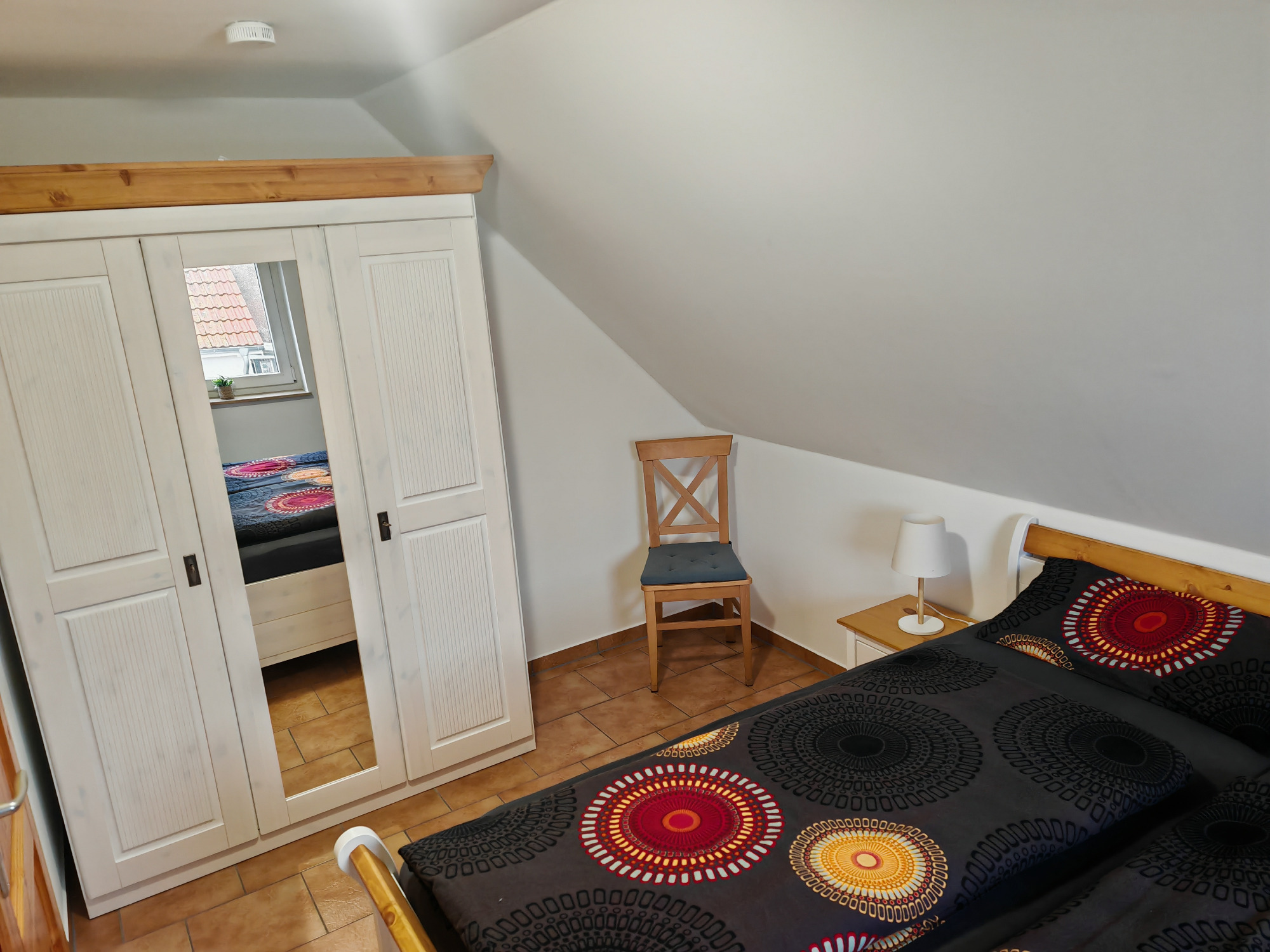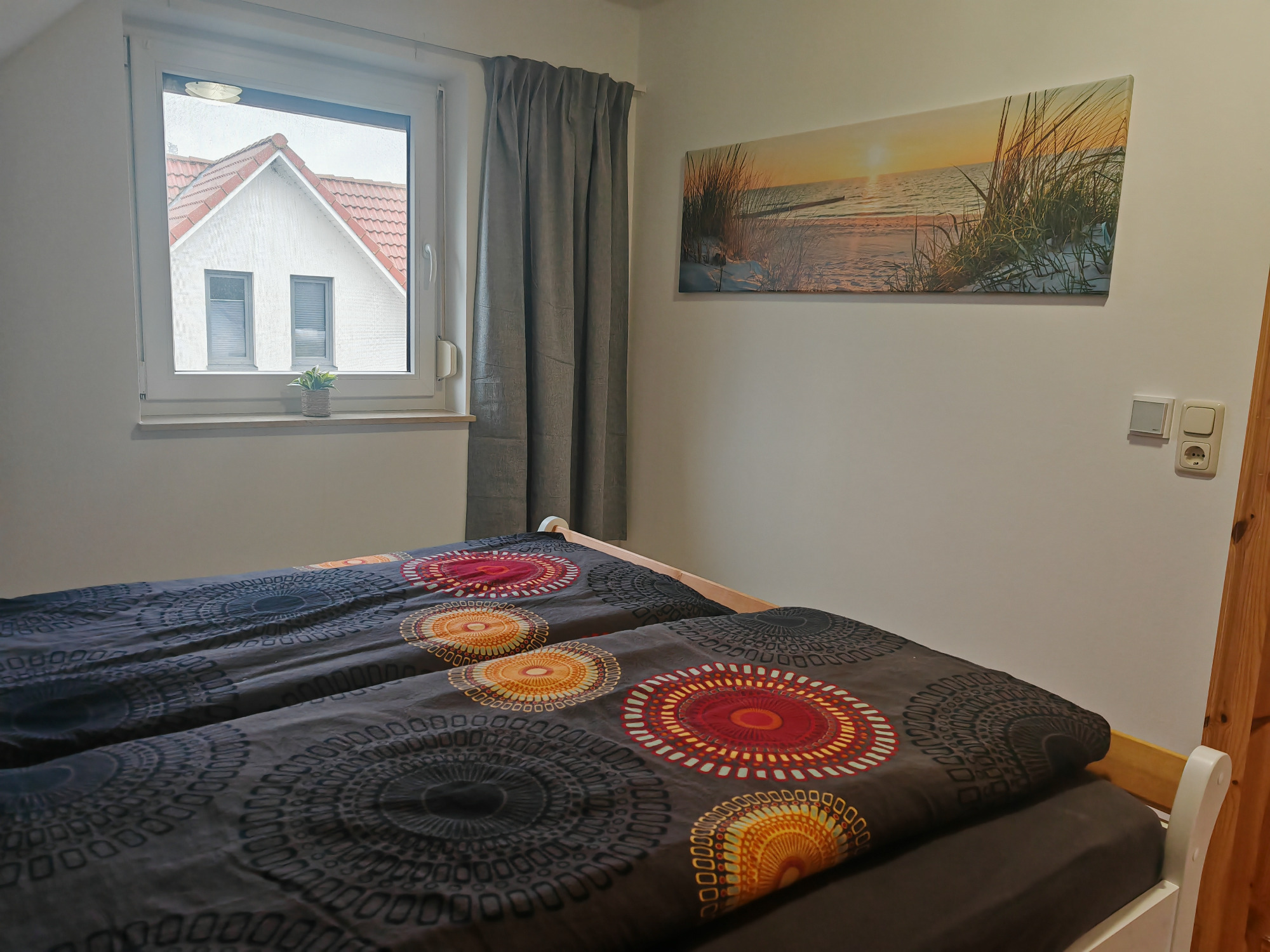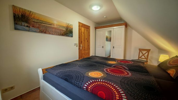 Im Obergeschoss sorgen zwei Schlafzimmer (1x mit Doppelbett und 1x mit zwei Einzelbetten) für komfortablen Schlaf. An allen Fenstern des Hauses sind Außenrollläden vorhanden. Für die kleinsten Gäste steht ein Kinderhochstuhl bereit. Für Ihre Autos stehen zwei Außenstellplätze unmittelbar vor dem Haus zur Verfügung.