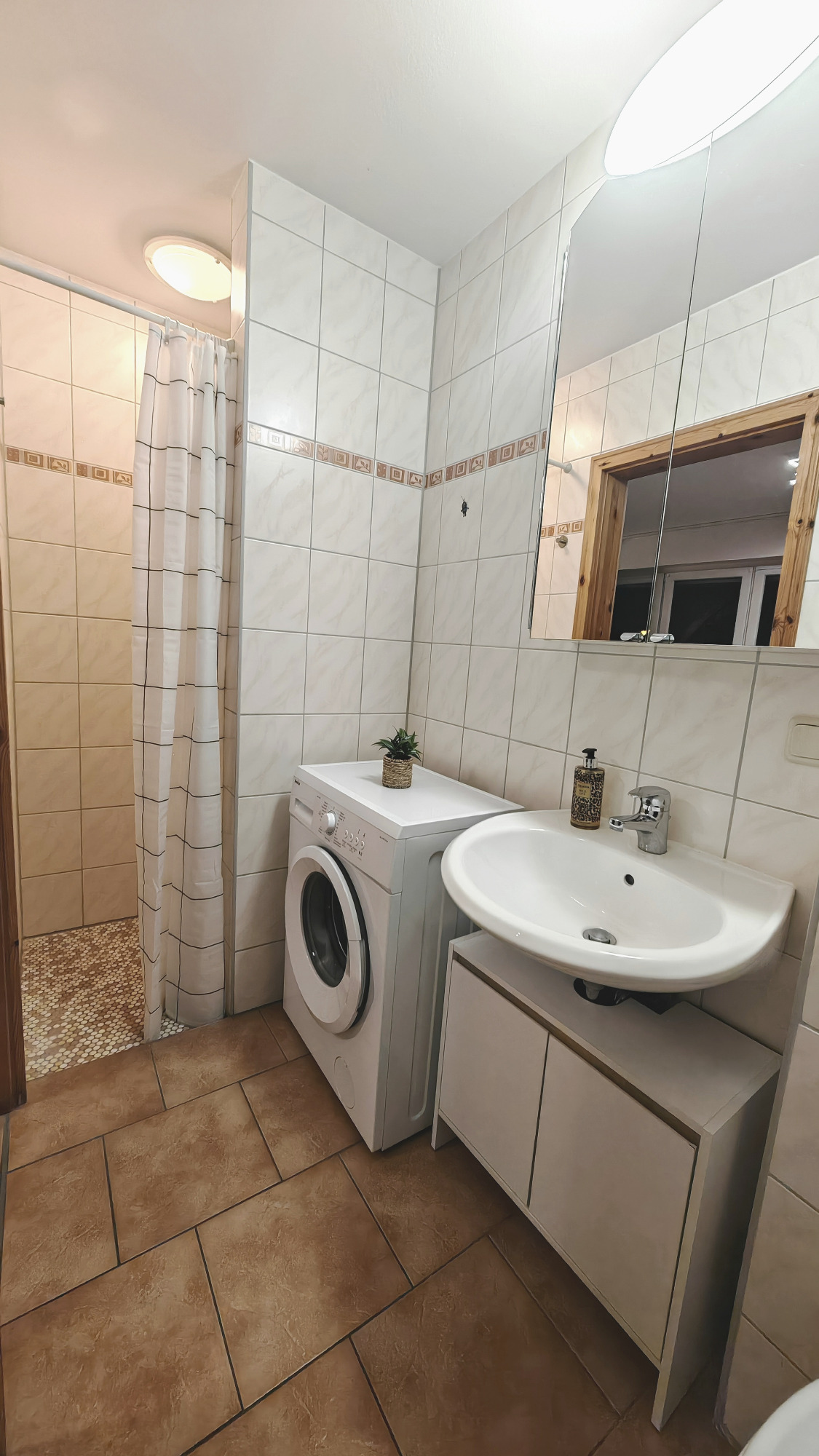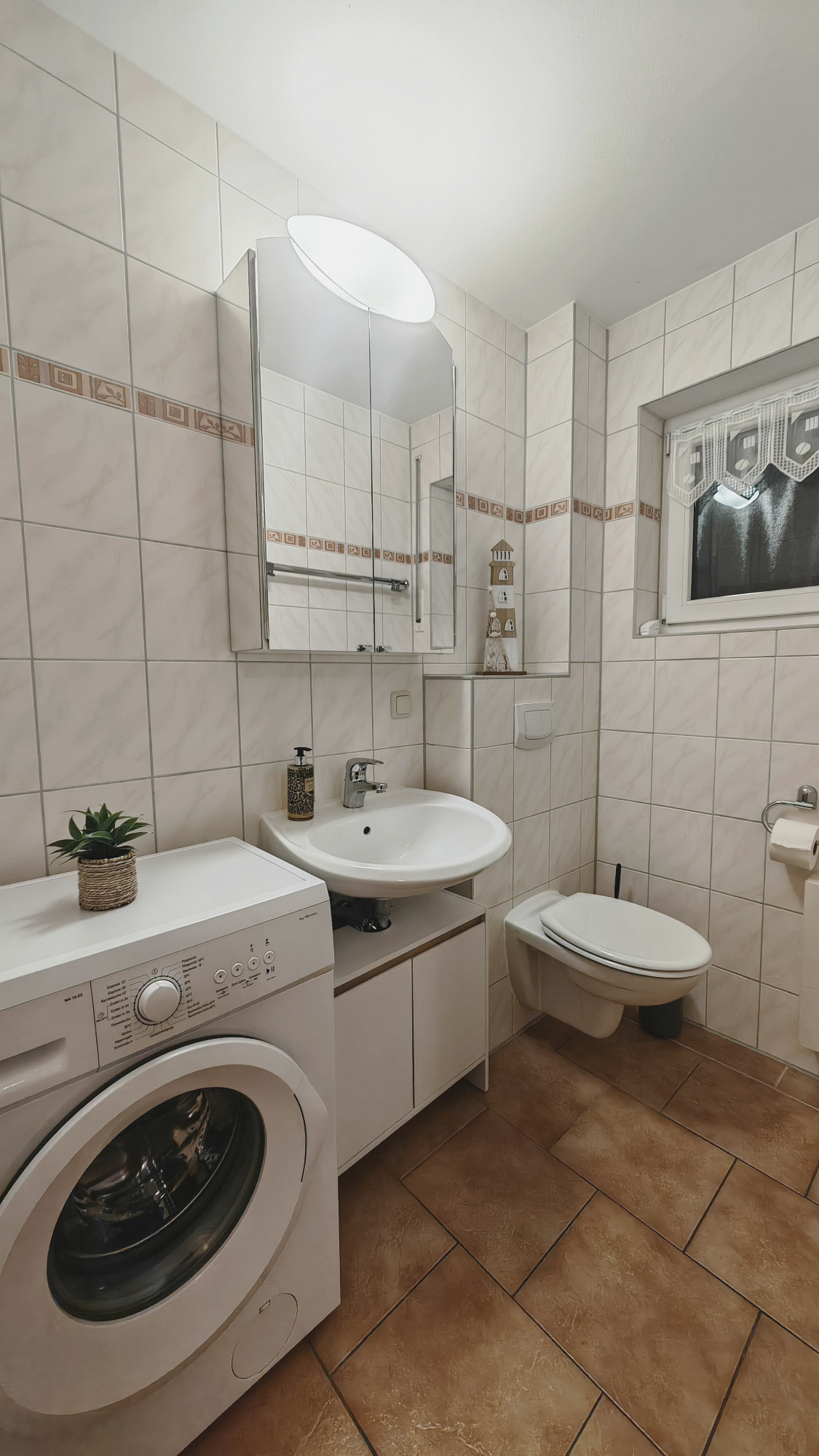 Das Bad ist mit einer Dusche, Waschbecken, WC, Waschmaschine ausgestattet. Vom Wohn-/ Esszimmer hat man direkten Zugang zur großen, möblierten Terrasse sowie dem angrenzenden Grundstück. Das Erdgeschoß und Obergeschoss ist komplett gefliest. Eine Fußbodenheizung sorgt für wohlige Wärme.