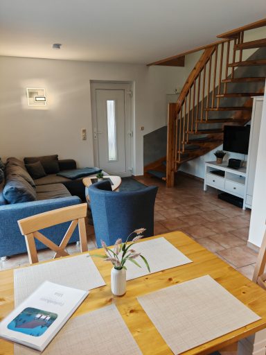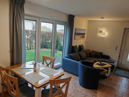 Die Doppelhaushälfte bietet Ihnen bei einer Wohnfläche von ca. 56 m² und einer großen Terrasse ein angenehmes Wohnerlebnis. Das Haus verfügt im Erdgeschoss über einen hellen Wohn-/ Essbereich (ausziehbare Schlafcouch für die 5. und 6. Person) mit einer integrierten Küche. Die Küche ist modern und komplett ausgestattet ( Backofen mit integrierter Mikrowelle, Cerankochfeld, Geschirrspüler, Kühlschrank mit Gefrierfach, Wasserkocher, Toaster und Kaffeemaschine). Im Wohnzimmer ist ein TV Gerät, ein Radio und ein CD-Player vorhanden.