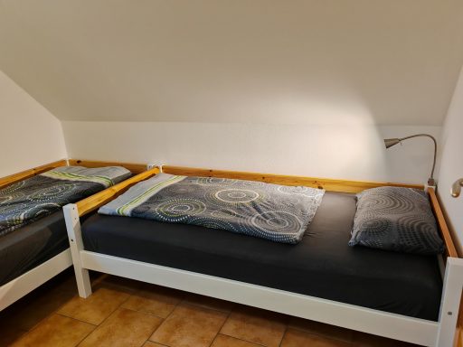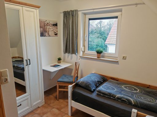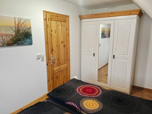 Im Obergeschoss sorgen zwei Schlafzimmer (1x mit Doppelbett und 1x mit zwei Einzelbetten) für komfortablen Schlaf. An allen Fenstern des Hauses sind Außenrollläden vorhanden. Für die kleinsten Gäste steht ein Kinderhochstuhl bereit. Für Ihre Autos stehen zwei Außenstellplätze unmittelbar vor dem Haus zur Verfügung.